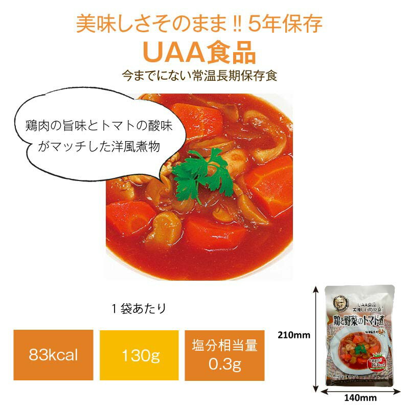 5年保存 非常食 おかず UAA食品 美味しい防災食カロリーコントロール 鶏と野菜のトマト煮 50袋セット 内容量(1袋あたり) 130g 栄養成分表示(1食あたり) エネルギー80kcal たんぱく質5.1g 脂質2.6g 炭水化物9.0g 食塩相当量0.4g 納期 ※こちらの商品は、メーカー長期欠品により商品が整わない場合がございます。