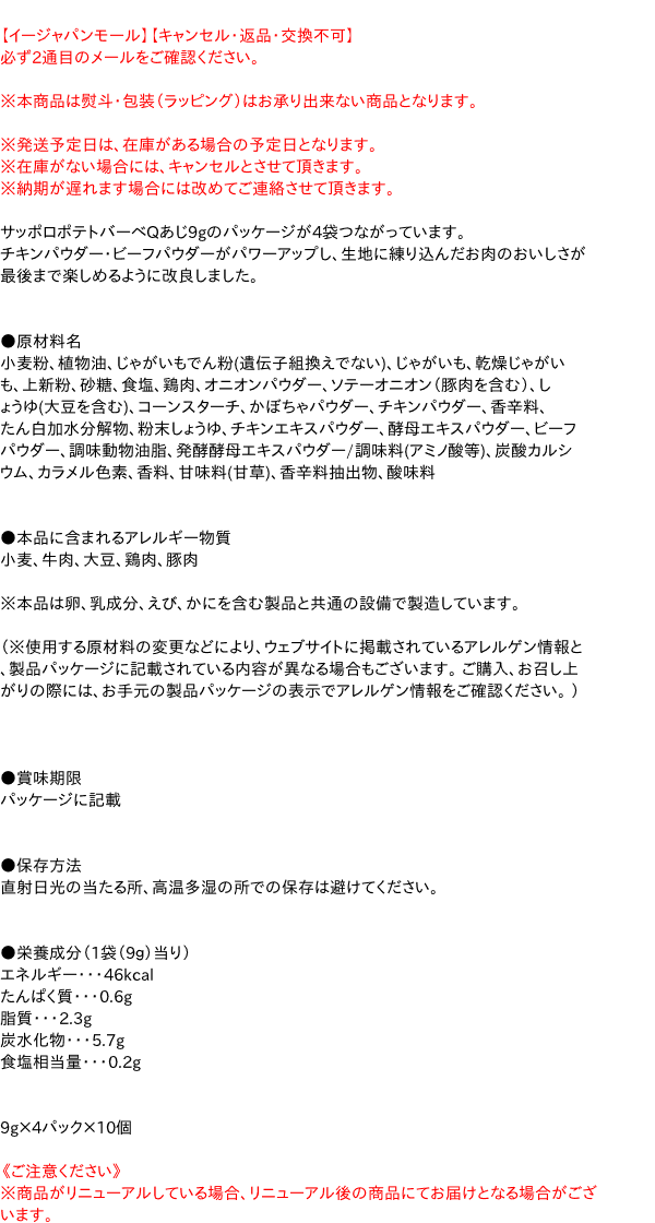 [関連キーワード:お菓子 おやつ スナック スナック菓子 和風 フライ じゃがいも]カルビー(株) サッポロポテト バーベQあじ ミニ4 9g×4パック はコチラ >>【イージャパンショッピングモール】内のみのお買い物は、送料一律でどれだけ買っても同梱する事が出来ます。